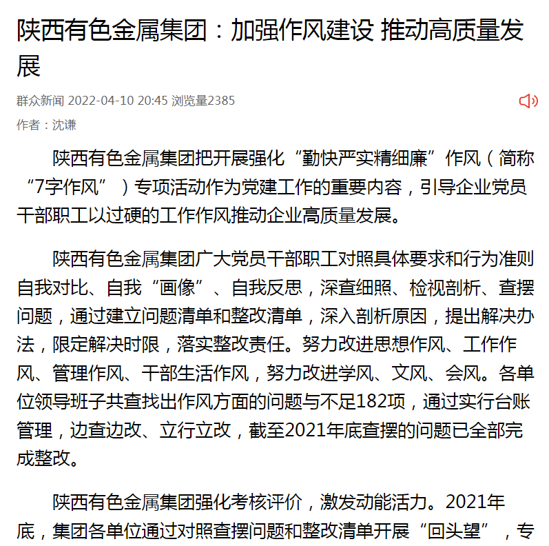 陜西有色金屬集團把開展強化“勤快嚴(yán)實精細(xì)廉”作風(fēng)(簡稱“7字作風(fēng)”)專項活動作為黨建工作的重要內(nèi)容,引導(dǎo)企業(yè)黨員干部職工以過硬的工作作風(fēng)推動企業(yè)高質(zhì)量發(fā)展。