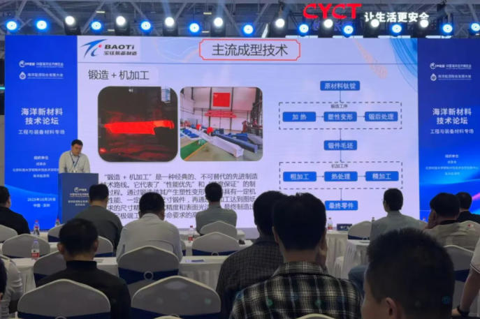 展會期間,寶鈦股份營銷部門與寶鈦研究院專家團(tuán)隊(duì)緊密配合,為來自全球的海洋裝備制造商及科研機(jī)構(gòu)提供從技術(shù)咨詢到商務(wù)洽談的一站式專業(yè)服務(wù)。在“海洋新材料技術(shù)論壇——工程與裝備材料專場”上,裝備制造公司趙彤作專題技術(shù)報(bào)告,分享了寶鈦在高端裝備材料應(yīng)用方面的最新研究成果。