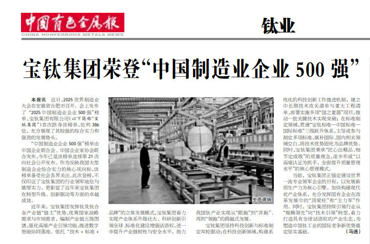 近日,2025世界制造業(yè)大會(huì)在安徽省合肥市召開。會(huì)上發(fā)布了“2025中國制造業(yè)企業(yè)500強(qiáng)”榜單,寶鈦集團(tuán)有限公司(以下簡(jiǎn)稱“寶鈦集團(tuán)”)首次躋身該榜單,位列386位,充分展現(xiàn)了其較強(qiáng)的綜合實(shí)力和強(qiáng)勁的發(fā)展勢(shì)頭。
