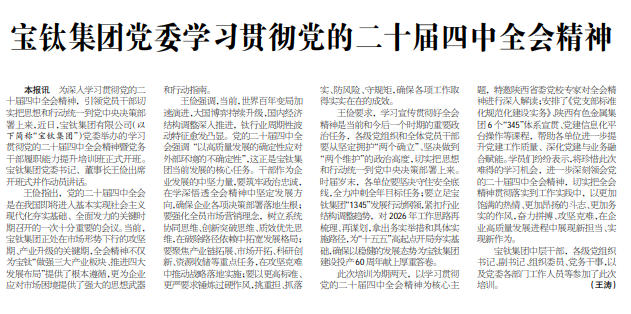 王儉要求,學(xué)習(xí)宣傳貫徹好全會精神是當(dāng)前和今后一個時期的重要政治任務(wù),各級黨組織和全體黨員干部要從堅定擁護(hù)“兩個確立”、堅決做到“兩個維護(hù)”的政治高度,切實把思想和行動統(tǒng)一到黨中央決策部署上來。時屆歲末,各單位要堅決守住安全底線,全力沖刺全年目標(biāo)任務(wù);要立足寶鈦集團(tuán)“1345”發(fā)展行動綱領(lǐng),緊扣行業(yè)結(jié)構(gòu)調(diào)整趨勢,對2026年工作思路再梳理、再謀劃,拿出務(wù)實舉措和具體實施路徑,為“十五五”高起點開局夯實基礎(chǔ),確保以穩(wěn)健的發(fā)展態(tài)勢為寶鈦集團(tuán)建設(shè)投產(chǎn)60周年獻(xiàn)上厚重答卷。