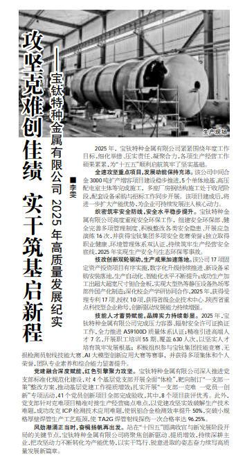 2025年,寶鈦特種金屬有限公司緊緊圍繞年度工作目標(biāo),細(xì)化舉措、壓實責(zé)任、凝聚合力,各項生產(chǎn)經(jīng)營工作碩果累累,為“十五五”順利啟航筑牢了堅實基礎(chǔ)。