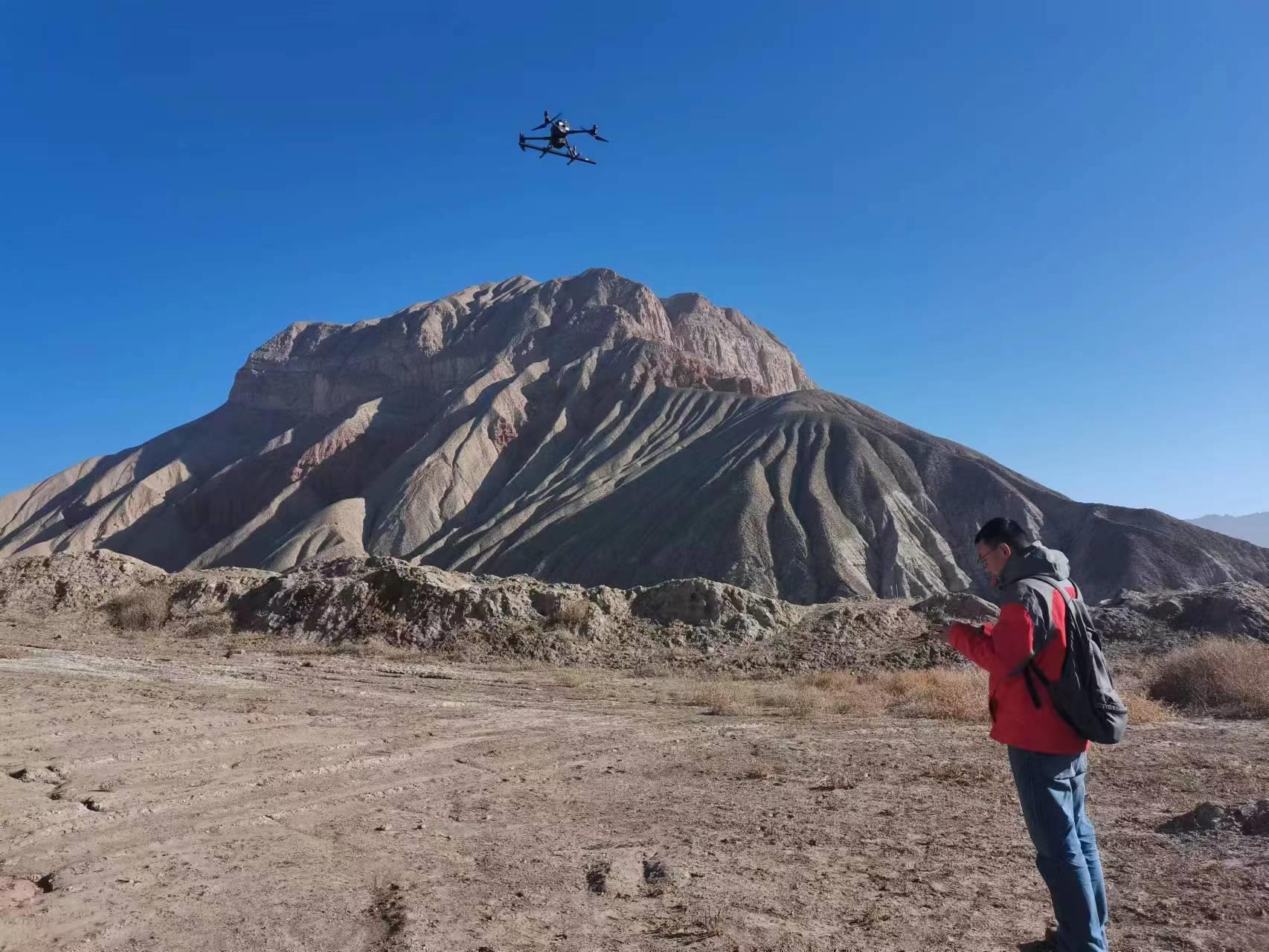 ▲新疆喀什煤田火燒區(qū)探測項目飛手正在進行低空航磁數(shù)據(jù)采集