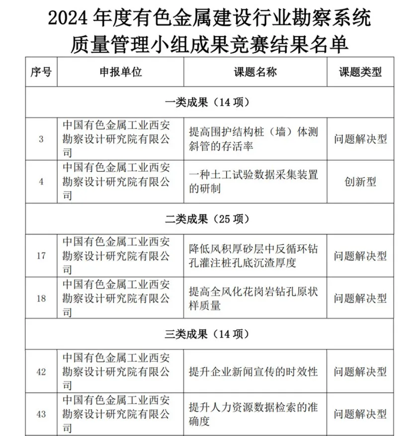 近日,中國(guó)有色金屬建設(shè)協(xié)會(huì)公布了2024年度有色建設(shè)行業(yè)勘察系統(tǒng)質(zhì)量管理小組成果競(jìng)賽活動(dòng)(部級(jí))獲獎(jiǎng)項(xiàng)目名單,西安勘察設(shè)計(jì)院組織申報(bào)的《提高圍護(hù)結(jié)構(gòu)樁(墻)體測(cè)斜管的存活率》《一種土工試驗(yàn)數(shù)據(jù)采集裝置的研制》等6項(xiàng)成果,分獲一、二、三獎(jiǎng)。