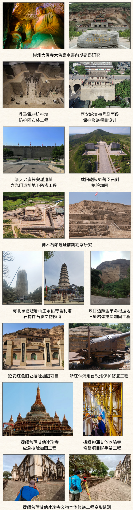 當歷史的塵埃落定,文物成為文明傳承的鮮活載體。工程公司深耕文物保護領(lǐng)域近30載,用專業(yè)與創(chuàng)新鑄就品牌力量,是文物保護領(lǐng)域的“生力軍”。如今,工程公司已構(gòu)建起覆蓋文物勘查、評估、勘察設(shè)計、施工、預防性保護,文物遷移以及數(shù)字化應(yīng)用的全鏈條服務(wù)體系,業(yè)務(wù)范圍涵蓋古遺址、古墓葬、古建筑、石窟寺、石刻及近現(xiàn)代重要史跡等各類文物保護。公司立足陜西,輻射全國十余省市,更成功拓展至緬甸等共建“一帶一路”國家,跨區(qū)域、跨文化服務(wù)綜合實力尤為突出。