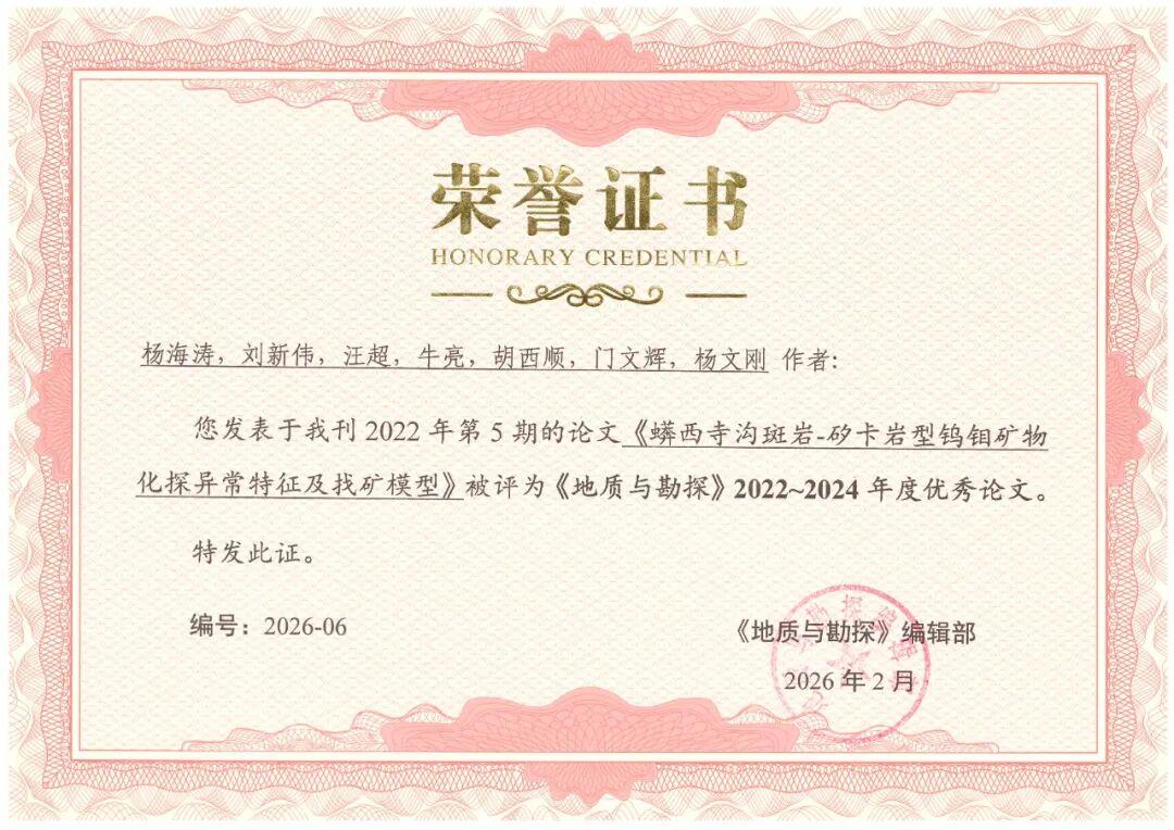 近日,中國科技核心期刊與中文核心期刊——《地質(zhì)與勘探》公布了2022-2024年度優(yōu)秀論文評選結(jié)果。研究院公司職工楊海濤等人撰寫的《蠎西寺溝斑巖-矽卡巖型鎢鉬礦物化探異常特征及找礦模型》一文獲評“優(yōu)秀論文”。