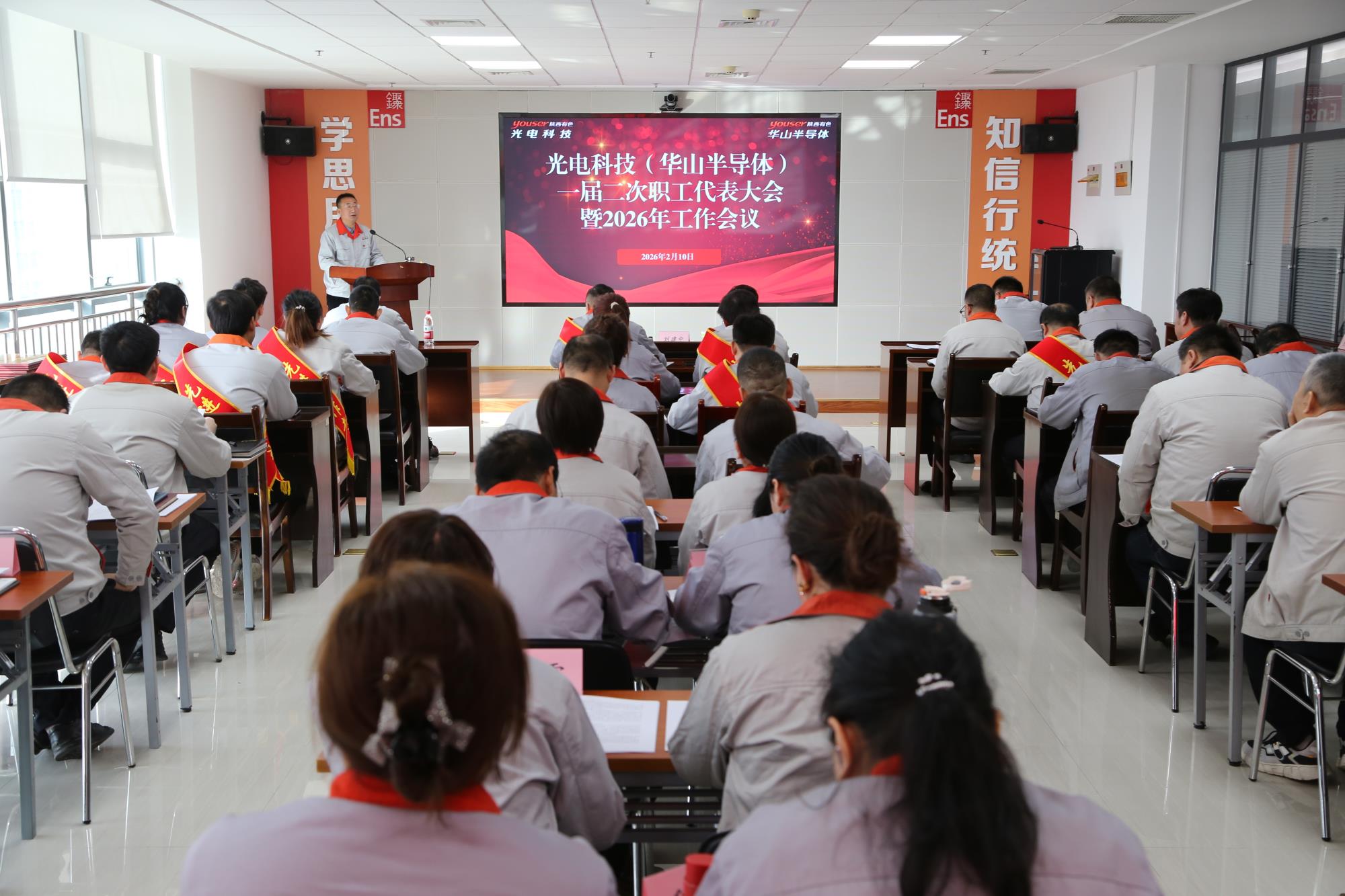 2月10日,光電科技(華山半導(dǎo)體)召開一屆二次職工代表大會暨2026年工作會議。會議深入貫徹落實集團公司三屆四次職代會暨2026年工作會議精神,全面總結(jié)2025年及“十四五”發(fā)展成效,科學(xué)謀劃“十五五”發(fā)展藍圖,系統(tǒng)部署2026年重點任務(wù),動員全體干部職工以實干擔(dān)當(dāng),奮力譜寫高質(zhì)量發(fā)展提質(zhì)見效新篇章。公司黨委書記、董事長劉建中出席會議并講話。公司領(lǐng)導(dǎo)班子成員,職工代表、列席代表,以及受表彰的先進集體代表和先進個人參加會議,工會主席鄭興貴主持會議。