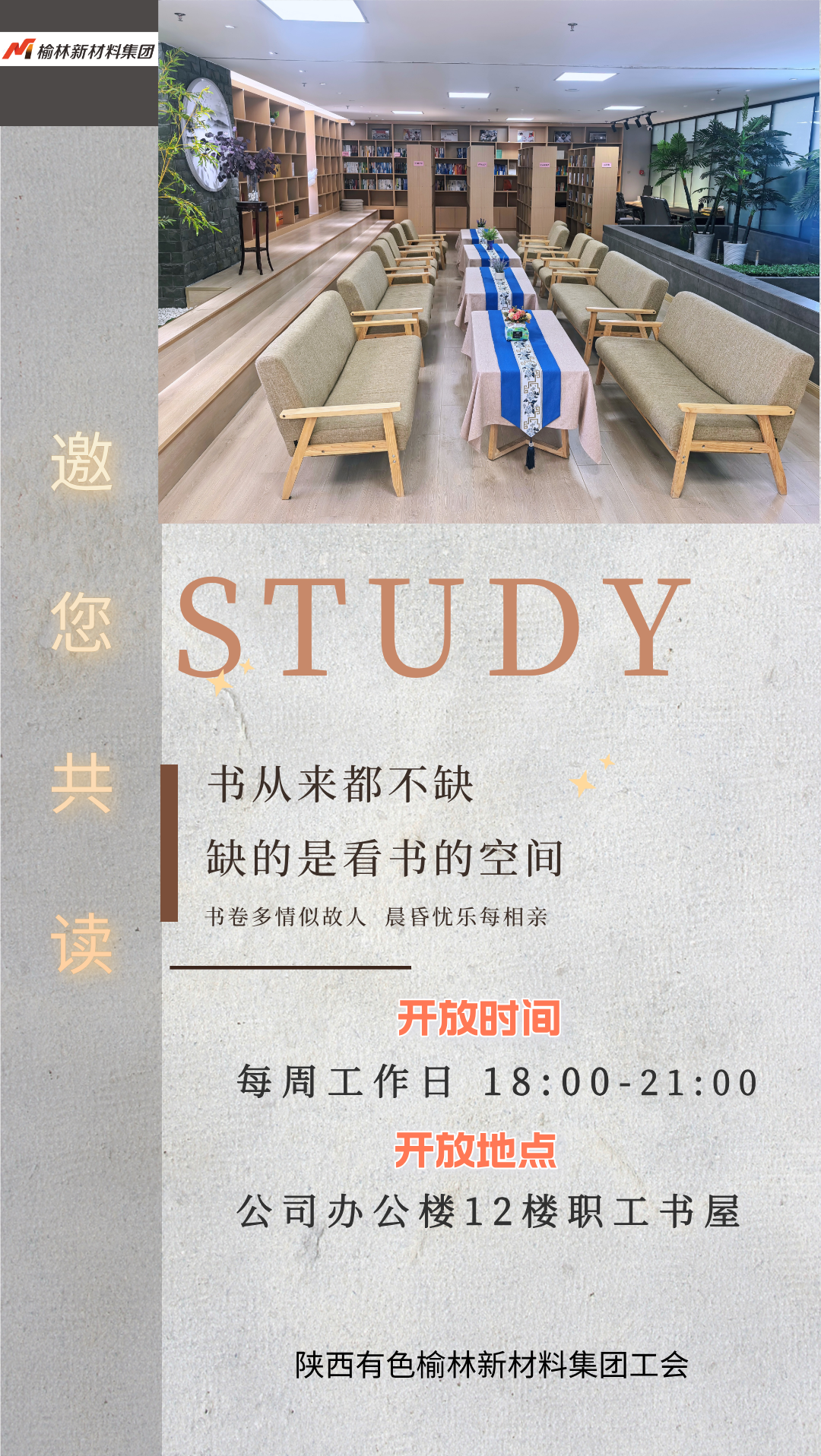 每當暮色四合,榆林新材料集團辦公樓12樓的燈光會如約亮起。這里沒有加班的鍵盤聲、機器的轟鳴聲,只有書頁翻動的輕響——這里是職工書屋,每個工作日的18:00至21:00,這里逐漸成為同事們下班后的心靈驛站,正以一片暖光守候每一位晚歸的同事。